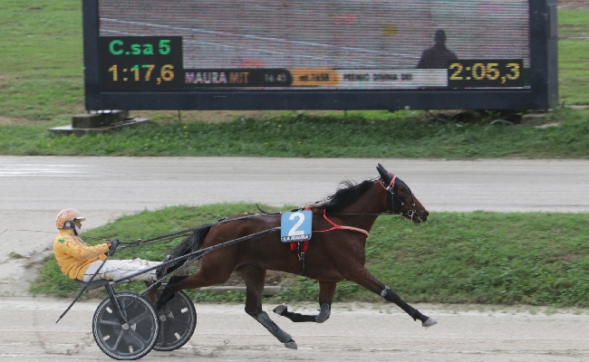 La pista appesantita dalla pioggia ha indubbiamente favorito chi ha corso al comando e di contro penalizzato che è stato chiamato a costruirsi la corsa all’esterno. Un vantaggio del quale probabilmente Zodiac Dany Grif avrebbe anche potuto fare a meno: l’allievo di Edo Loccisano infatti è ormai un perfetto cavallo da corsa e nel Premio Allevamento Fata Tuscania ha firmato il quinto successo consecutivo, il sesto (su sette uscite) dell’annata. Il figlio di Ready Cash ha presto superato Amarcord, ha imposto ritmo brillante per non farsi avvicinare da Cagliostro e ha proseguito sicuro sino in fondo chiudendo a media di 1.14.8. Cagliostro ha accusato la fatica e ha mollato la presa ai 300 finali, l’appostato Amarcord non è riuscito a rendersi minaccioso in retta, come pure Ambra Matto, che ha badato giudiziosamente al terzo posto. Non avrà lo strike rate di Zodiac Dany Grif, ma in termini di redditività non scherza neppure Enorme Nap: nel Premio Ora Pro Nobis, il cavallo di Giulia Deschi e Francesco Tufano (qui anche alle redini) ha colto la terza vittoria nelle ultime quattro uscite al termine dell’ennesimo percorso di testa vincente del pomeriggio: nonostante la spesa iniziale per difendere la posizione, il figlio di Wishing Stone ha spaziato a media di 1.16.8, mentre più indietro Enos finiva bene a battere Elite Cam per il secondo. Una prestazione di spessore, quella che ha visto protagonista Danilo Spritz nel Premio Allevamento Divina Bombolotta, la prova sui 1650 metri per cavalli di 4 anni con alla guida i gentlemen: con Michele Bechis ai comandi, il cavallo di Mauro Baroncini ha forzato nella fase iniziale sfilando al comando dopo 400 metri veloci su Du Quoin As, poi ha proseguito senza tentennamenti (chilometro in 1.13.8) aumentando progressivamente il vantaggio sulla rivale di Fausto Barelli per dominare a media di 1.14.1. Ritorno prepotente al successo per il figlio di No Reply, rivisto nel suo assetto migliore. Du Quoin As ha tenuto la scia del vincitore sinché ha potuto, poi si è adeguata al secondo posto: Downtown As ha corso all’attesa mettendosi in azione solo nei 400 finali per finire forte e chiudere altrettanto chiaro al terzo posto. Tutto abbastanza facile per la netta favorita Funny Gio (altro successo del pomeriggio per Alessandro Gocciadoro) nel Premio Divina Dei: la figlia di Face Time Bourbon ha rilevato in breve al comando Fenomen Sa, ha ribattuto all’attacco della rivale ai 400 finali e in retta si è svincolata per vincere a media di 1.16.1. Fenomen Sa ha pagato l’ardire calando in retta, dove è stata sopravanzata per il secondo posto da Filly Mail. Il prossimo appuntamento è per martedì 24 con il programma che prevede anche il trotto montato, mentre il clou del mese è per domenica 29 ottobre con l’atteso Gran Premio delle Nazioni – Memorial Edoardo Gubellini.