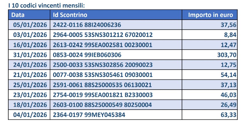ROMA - Sono stati estratti i 10 codici vincenti del concorso mensile di febbraio della Lotteria degli scontrini. Di seguito gli scontrini che si aggiudicano 100mila euro ciascuno, comunicati dall'Agenzia Dogane e Monopoli: