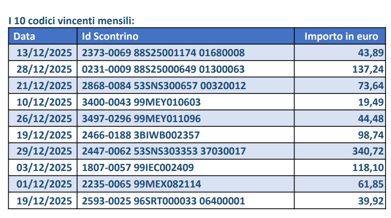 ROMA - Sono stati estratti i 10 codici vincenti del concorso mensile di gennaio della Lotteria degli scontrini. Di seguito gli scontrini che si aggiudicano 100mila euro ciascuno, comunicati dall'Agenzia Dogane e Monopoli: