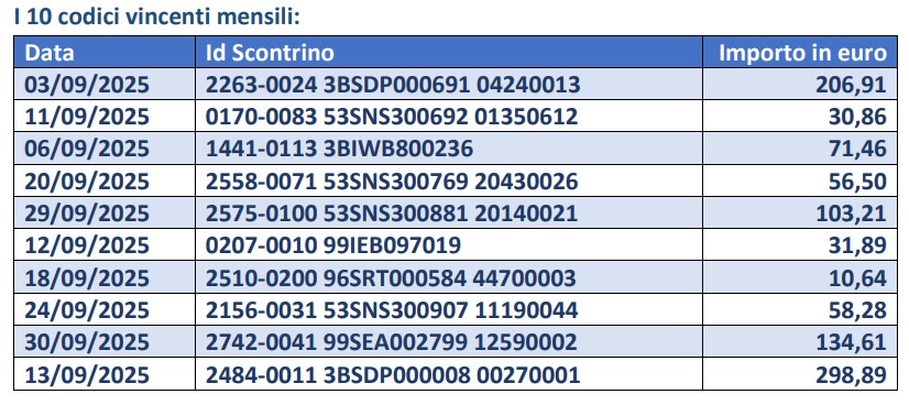 25/09/2025 | 15:10 ROMA - Sono stati estratti i 15 codici vincenti del concorso settimanale del 25 settembre della Lotteria degli scontrini: l’Agenzia Dogane e Monopoli ha diffuso i codici vincenti, ognuno dei quali si aggiudica 25mila...