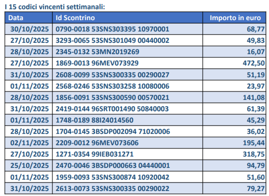 ROMA - Sono stati estratti i 15 codici vincenti del concorso settimanale del 6 novembre della Lotteria degli scontrini: l’Agenzia Dogane e Monopoli ha diffuso i codici vincenti, ognuno dei quali si aggiudica 25mila euro: