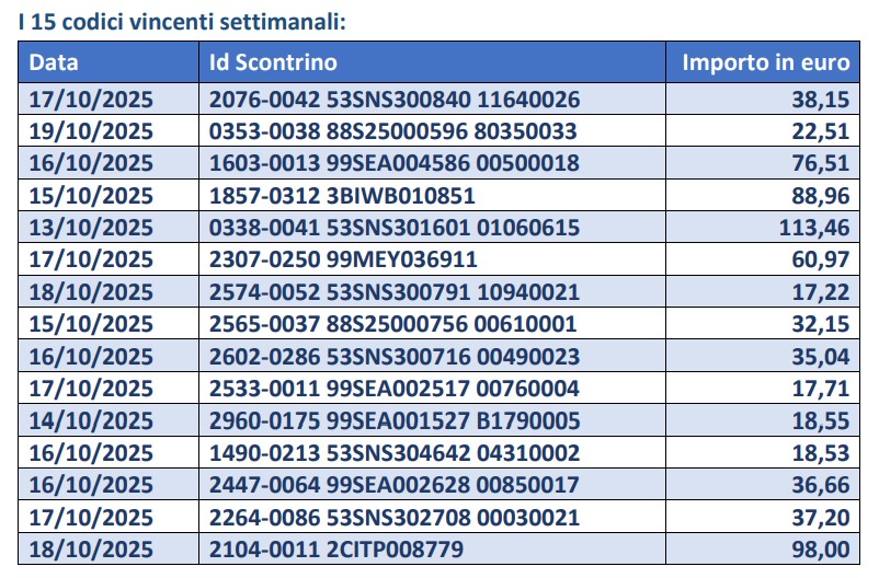 ROMA - Sono stati estratti i 15 codici vincenti del concorso settimanale del 23 ottobre della Lotteria degli scontrini: l’Agenzia Dogane e Monopoli ha diffuso i codici vincenti, ognuno dei quali si aggiudica 25mila euro: