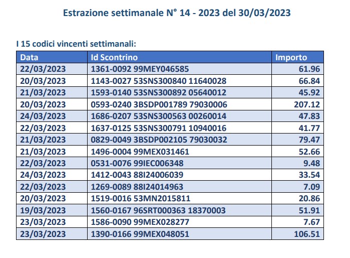 ROMA - Sono stati estratti i 15 codici vincenti del concorso settimanale del 30 marzo della Lotteria degli scontrini: l’Agenzia Dogane e Monopoli ha diffuso i codici vincenti, ognuno dei quali si aggiudica 25mila euro.