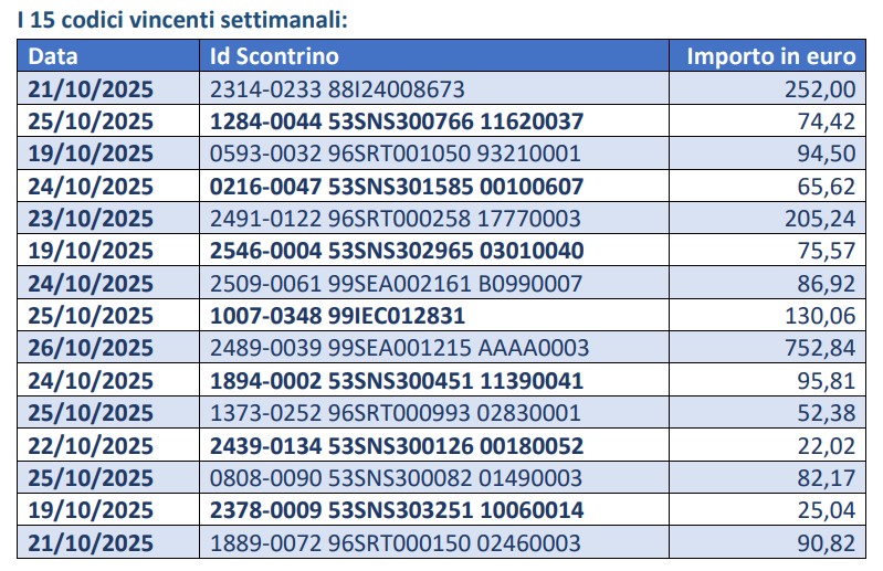 ROMA - Sono stati estratti i 15 codici vincenti del concorso settimanale del 30 ottobre della Lotteria degli scontrini: l’Agenzia Dogane e Monopoli ha diffuso i codici vincenti, ognuno dei quali si aggiudica 25mila euro: