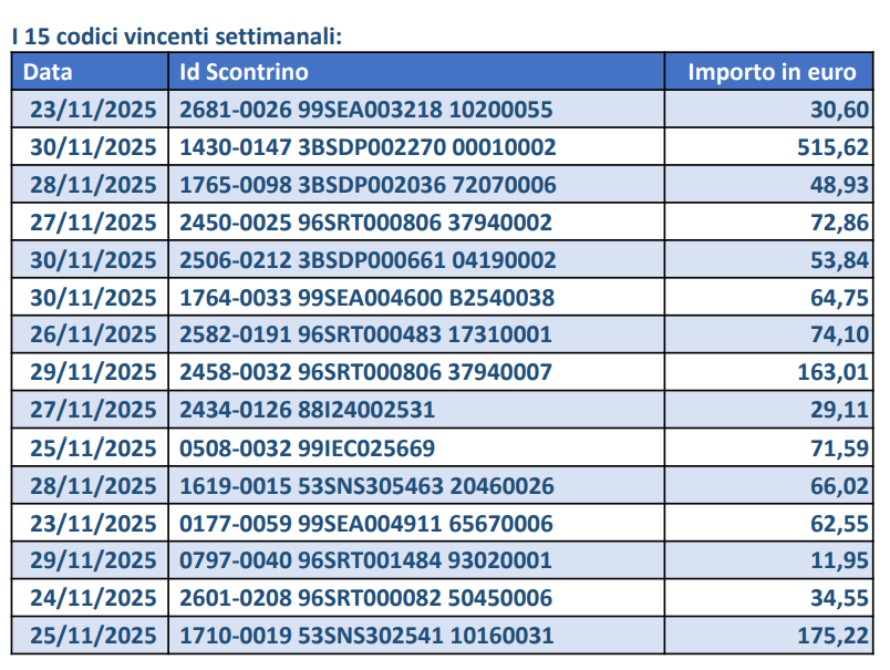 27/11/2025 | 15:00 ROMA - Sono stati estratti i 15 codici vincenti del concorso settimanale del 27 novembre della Lotteria degli scontrini: l’Agenzia Dogane e Monopoli ha diffuso i codici vincenti, ognuno dei quali si aggiudica 25mila...
