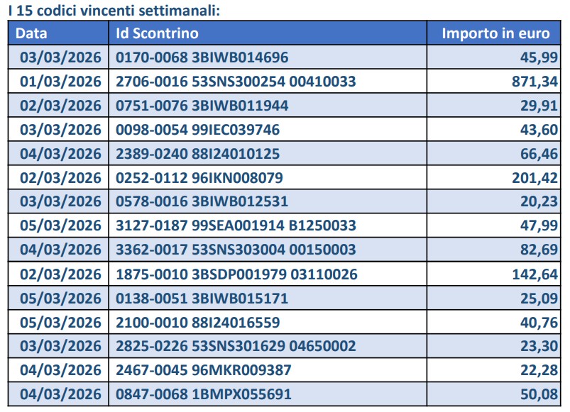 ROMA - Sono stati estratti i 15 codici vincenti del concorso settimanale del 12 marzo della Lotteria degli scontrini: l’Agenzia Dogane e Monopoli ha diffuso i codici vincenti, ognuno dei quali si aggiudica 25mila euro: