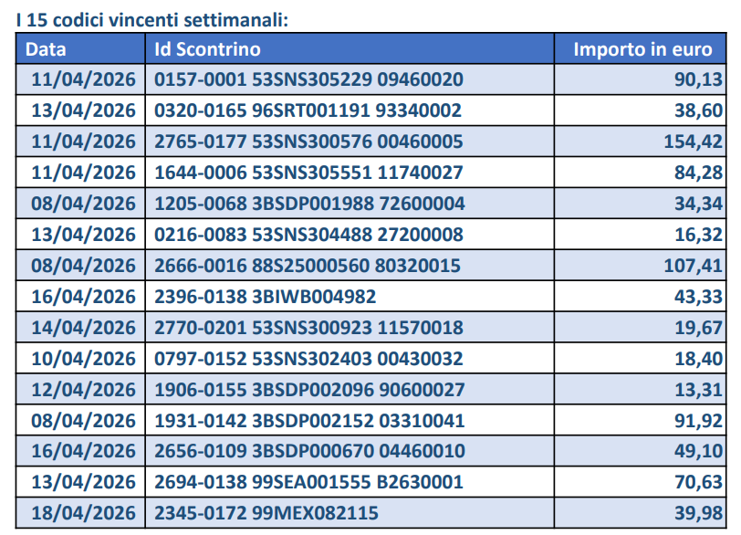 16/04/2026 | 15:00 ROMA - Sono stati estratti i 15 codici vincenti del concorso settimanale del 16 aprile della Lotteria degli scontrini: l’Agenzia Dogane e Monopoli ha diffuso i codici vincenti, ognuno dei...