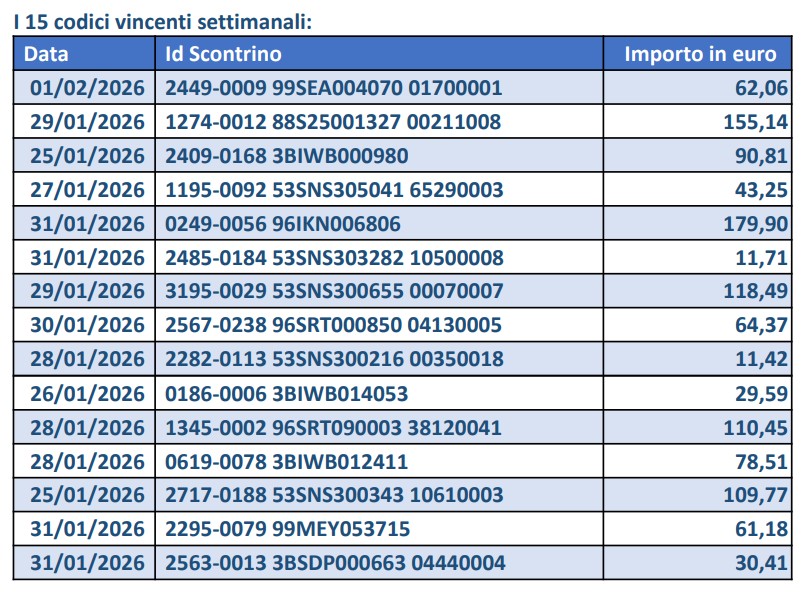 ROMA - Sono stati estratti i 15 codici vincenti del concorso settimanale del 5 febbraio della Lotteria degli scontrini: l’Agenzia Dogane e Monopoli ha diffuso i codici vincenti, ognuno dei quali si aggiudica 25mila euro: