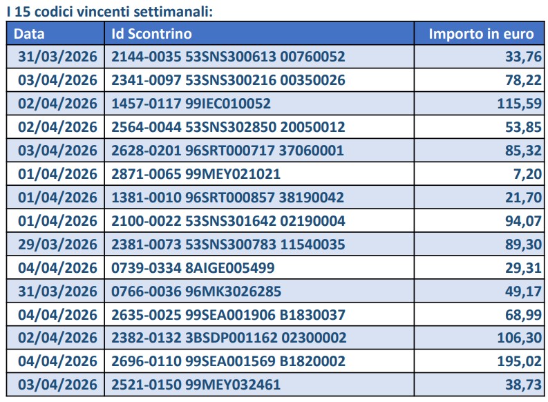 26/03/2026 | 14:50 ROMA - Sono stati estratti i 15 codici vincenti del concorso settimanale del 26 marzo della Lotteria degli scontrini: l’Agenzia Dogane e Monopoli ha diffuso i codici vincenti, ognuno dei quali...