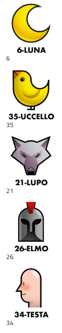 6-LUNA 35-UCCELLO 21-LUPO 26-ELMO 34-TESTA