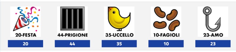 20-FESTA 44-PRIGIONE 35-UCCELLO 10-FAGIOLI 23-AMO