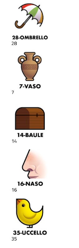 28-OMBRELLO 7-VASO 14-BAULE 16-NASO 35-UCCELLO