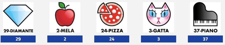 29-DIAMANTE 2-MELA 24-PIZZA 3-GATTA 37-PIANO