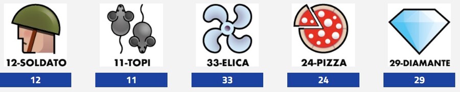 12-SOLDATO 11-TOPI 33-ELICA 24-PIZZA 29-DIAMANTE