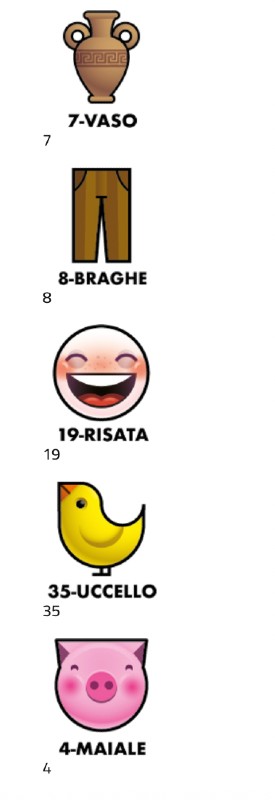 7-VASO 8-BRAGHE 19-RISATA 35-UCCELLO 4-MAIALE