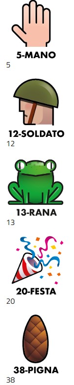 5-MANO 12-SOLDATO 13-RANA 20-FESTA 38-PIGNA
