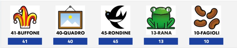 41-BUFFONE 40-QUADRO 45-RONDINE 13-RANA 10-FAGIOLI