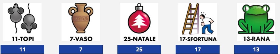 11-TOPI 7-VASO 25-NATALE 17-SFORTUNA 13-RANA