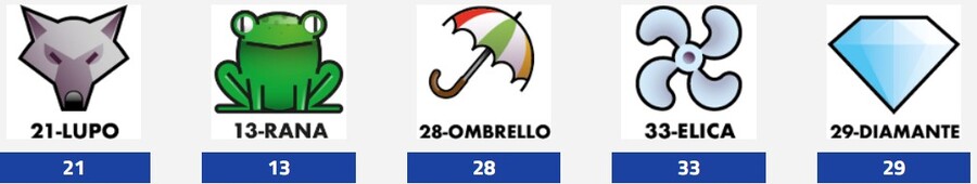 21-LUPO 13-RANA 28-OMBRELLO 33-ELICA 29-DIAMANTE