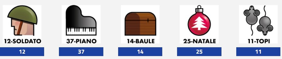12-SOLDATO 37-PIANO 14-BAULE 25-NATALE 11-TOPI