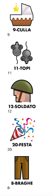 9-CULLA 11-TOPI 12-SOLDATO 20-FESTA 8-BRAGHE