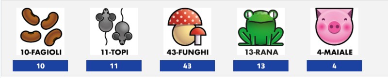10-FAGIOLI 11-TOPI 43-FUNGHI 13-RANA 4-MAIALE