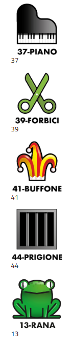 37-PIANO 39-FORBICI 41-BUFFONE 44-PRIGIONE 13-RANA