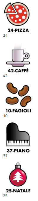 24-PIZZA 42-CAFFÈ 10-FAGIOLI 37-PIANO 25-NATALE
