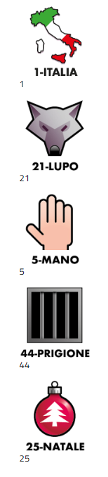 1-ITALIA 21-LUPO 5-MANO 44-PRIGIONE 25-NATALE