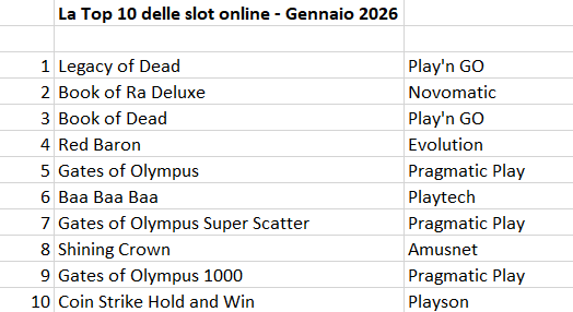 ROMA – I casinò online aprono il 2026 con un nuovo balzo in avanti. Nel mese di gennaio, la spesa ha raggiunto quota 325,2 milioni di euro, in crescita del 19% rispetto ai 273,6 milioni di euro registrati nello stesso mese dello scorso anno. A trainare il successo delle sale da gioco virtuali, ancora una volta, è il segmento delle slot online, che rappresenta circa il 65% del settore. Nella classifica stilata dal sito britannico igamingtracker.com, il prodotto preferito dagli italiani è – per la prima volta negli ultimi tre anni – “Legacy of Dead” del provider svedese Play’n GO, che ha superato “Book of Ra Deluxe” targato Novomatic. Al terzo posto, di nuovo una slot Play’n GO – “Book of Dead” – davanti a “Red Baron” di Evolution e “Gates of Olympus” di Pragmatic Play. Sale in graduatoria “Baa Baa Baa” di Playtech, al sesto posto, che precede in Top10 “Shining Crown” di Amusnet, “Gates of Olympus – Super Scatter” sempre di Pragmatic e “Coin Strike Hold and Win” (Playson). La graduatoria, che potete leggere nella tabella qui sotto, è stata fornita ad Agipronews dal sito specializzato inglese igamingtracker.com che analizza, attraverso un complesso sistema di monitoraggio della rete, l’andamento dei casinò online internazionali. I dati estratti per l’Italia provengono dall’analisi continuativa di tutte le pagine dei casinò autorizzati nel nostro paese, ponderati in base alle posizioni dei giochi (in alto o in basso) sui vari siti e tenendo conto anche della grandezza di ciascun operatore: in sostanza, le slot esposte su un marchio “top” varranno di più rispetto a quelle presenti su un sito di un operatore piccolo. La tabella fornita da igamingtracker.com comprende le prime 20 posizioni della classifica: i dati completi sono riservati agli abbonati ad Agipronews che ne faranno richiesta.
