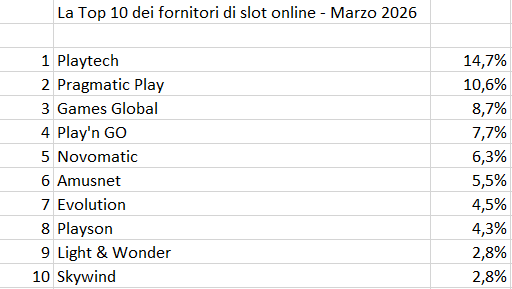 ROMA – Playtech rafforza il primato nella classifica dei fornitori di slot online, sempre davanti a Pragmatic Play. Le quote di mercato dei due colossi sono adesso separate da oltre 4 punti: 14,7% Playtech, 10,6% Pragmatic. Secondo i dati elaborati in esclusiva per Agipronews dal sito inglese igamingtracker.com, restano stabili le altre posizioni di testa della graduatoria: Games Global si conferma al terzo posto con una quota di mercato che si attesta all’8,7%, davanti a Play’n GO (7,7%). Novomatic si piazza al quinto posto ribadendo il proprio 6,3%, mentre Amusnet (5,5%) guadagna la sesta posizione davanti ad Evolution (4,5%). Per quanto concerne i ricavi dei fornitori, il Ggr (Gross Gaming Revenue) dell’intero settore dei casinò in marzo è stato pari a 304 milioni di euro. La quota di mercato delle slot – spiegano gli addetti ai lavori ad Agipronews – ha superato quota 198 milioni di euro: tolte tasse e bonus, il segmento ha generato circa 120 milioni di ricavi. Il 10% della cifra – calcolato come media tra contratti diretti e aggregatori – finisce ai produttori di macchinette online, che hanno dunque incassato in febbraio una somma lorda complessiva pari a 12 milioni di euro. La Top10, che potete leggere nella tabella qui sotto, è stata fornita in esclusiva ad Agipronews dal sito inglese specializzato igamingtracker.com, che analizza, grazie a un complesso sistema di monitoraggio della rete, i prodotti più diffusi nelle pagine dei casinò. I dati estratti per l’Italia sono ponderati in base alle posizioni (in alto o in basso) dei giochi nei vari siti e tenendo conto anche della dimensione di ciascun operatore: in sostanza, le macchinette virtuali esposte su un marchio “top” varranno di più rispetto a quelle presenti su un sito di un operatore più piccolo. Non si tratta quindi di ricavi lordi (Ggr) provenienti dalle partite – è bene chiarirlo - ma di spazio e posizione delle slot online nei vari siti esaminati. La classifica, spiegano gli operatori, ha un’alta affidabilità proprio perché le slot di successo sono quelle poste in maggiore evidenza dagli operatori e “misurate” nel dettaglio da igamingtracker.com. L’elaborazione di tutti questi elementi produce la graduatoria dei migliori fornitori.