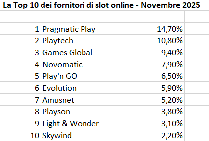 ROMA – Pragmatic Play allunga decisamente su Playtech nella classifica di novembre dei fornitori di slot online per i casinò virtuali italiani. Secondo i dati elaborati in esclusiva per Agipronews dal sito inglese igamingtracker.com, sono quattro i punti di distanza tra i due supplier: 14,7% contro 10,8%. Sorpasso confermato anche in terza posizione, laddove Games Global (9,4%) resta davanti a Novomatic (7,9%) e Play’n GO (6,5%), attualmente quinta. Continua invece la discesa di Evolution, scesa al sesto posto dopo un lunghissimo periodo in cui sembrava l’unico terzo rivale possibile tra Pragmatic e Playtech. Nelle prime dieci posizioni anche Amusnet, Playson, Light&Wonder e Skywind. Per quanto concerne i ricavi dei fornitori, il Ggr (Gross Gaming Revenue) dell’intero settore dei casinò in novembre è stato pari a 277 milioni di euro. La quota di mercato delle slot – spiegano gli addetti ai lavori ad Agipronews – ha superato i 180 milioni di euro: tolte tasse e bonus, il segmento ha generato circa 108 milioni di ricavi. Il 10% della cifra – calcolato come media tra contratti diretti e aggregatori – finisce ai produttori di macchinette online, che hanno dunque incassato in novembre una somma lorda complessiva di circa 10,8 milioni di euro. La Top10, che potete leggere nella tabella qui sotto, è stata fornita in esclusiva ad Agipronews dal sito inglese specializzato igamingtracker.com, che analizza, grazie a un complesso sistema di monitoraggio della rete, i prodotti più diffusi nelle pagine dei casinò. I dati estratti per l’Italia sono ponderati in base alle posizioni (in alto o in basso) dei giochi nei vari siti e tenendo conto anche della dimensione di ciascun operatore: in sostanza, le macchinette virtuali esposte su un marchio “top” varranno di più rispetto a quelle presenti su un sito di un operatore piccolo. Non si tratta quindi di ricavi lordi (Ggr) provenienti dalle partite – è bene chiarirlo - ma di spazio e posizione delle slot online nei vari siti esaminati. La classifica, spiegano gli operatori, ha un’alta affidabilità proprio perché le slot di successo sono quelle poste in maggiore evidenza dagli operatori e “misurate” nel dettaglio da igamingtracker.com. L’elaborazione di tutti questi elementi produce la graduatoria dei migliori fornitori.