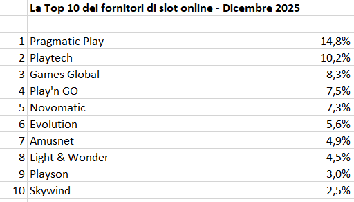 ROMA – Pragmatic Play sempre più sola in vetta. Il provider allunga decisamente su Playtech nella classifica di dicembre dei fornitori di slot online per i casinò virtuali italiani. Secondo i dati elaborati in esclusiva per Agipronews dal sito inglese igamingtracker.com, sono oltre quattro i punti di distanza tra i due supplier: 14,8% contro 10,2%. Games Global scende un po’ ma mantiene il terzo posto (8,3%) davanti a Play’n GO (7,5%) e Novomatic (7,3%). Evolution rimane al sesto posto, davanti ad Amusnet, Light&Wonder, Playson e Skywind. Per quanto concerne i ricavi dei fornitori, il Ggr (Gross Gaming Revenue) dell’intero settore dei casinò in dicembre è stato pari a 333,7 milioni di euro. La quota di mercato delle slot – spiegano gli addetti ai lavori ad Agipronews – ha superato i 216 milioni di euro: tolte tasse e bonus, il segmento ha generato circa 129,6 milioni di ricavi. Il 10% della cifra – calcolato come media tra contratti diretti e aggregatori – finisce ai produttori di macchinette online, che hanno dunque incassato in dicembre una somma lorda complessiva vicina ai 13 milioni di euro. La Top10, che potete leggere nella tabella qui sotto, è stata fornita in esclusiva ad Agipronews dal sito inglese specializzato igamingtracker.com, che analizza, grazie a un complesso sistema di monitoraggio della rete, i prodotti più diffusi nelle pagine dei casinò. I dati estratti per l’Italia sono ponderati in base alle posizioni (in alto o in basso) dei giochi nei vari siti e tenendo conto anche della dimensione di ciascun operatore: in sostanza, le macchinette virtuali esposte su un marchio “top” varranno di più rispetto a quelle presenti su un sito di un operatore piccolo. Non si tratta quindi di ricavi lordi (Ggr) provenienti dalle partite – è bene chiarirlo - ma di spazio e posizione delle slot online nei vari siti esaminati. La classifica, spiegano gli operatori, ha un’alta affidabilità proprio perché le slot di successo sono quelle poste in maggiore evidenza dagli operatori e “misurate” nel dettaglio da igamingtracker.com. L’elaborazione di tutti questi elementi produce la graduatoria dei migliori fornitori.