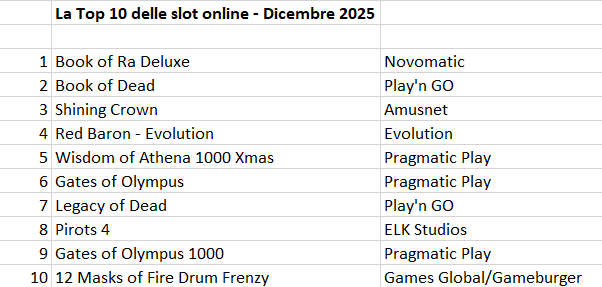 ROMA – I casinò online chiudono il 2025 in forte crescita. Il mese di dicembre, il primo interamente gestito tramite le nuove licenze online, si è chiuso con una spesa complessiva di 333,7 milioni di euro, in aumento del 18% rispetto allo stesso mese dell’anno precedente (282 milioni).  A trainare il successo delle sale da gioco virtuali è sempre il segmento delle slot online, che rappresenta circa il 65% del settore. Nella classifica stilata dal sito britannico igamingtracker.com, il prodotto preferito dagli italiani rimane “Book of Ra” di Novomatic, che mantiene la vetta. Play’n GO conferma “Book of Dead” al secondo posto, davanti a “Shining Crown” di Amusnet, che sale sul podio. Al quarto e al quinto posto, due titoli emergenti - “Red Baron” di Evolution e “Wisdom of Athena 1000 Xmas” – che precedono il classico “Gates of Olympus” di Pragmatic Play. Tante novità nella seconda parte della graduatoria, con “12 Masks of Fire Drum Frenzy” di Global Games/Gameburger Studios, “Divina Commedia I Nove Cerchi” (Pragmatic) e “Baa Baa Baa” firmato da Playtech. La graduatoria, che potete leggere nella tabella qui sotto, è stata fornita ad Agipronews dal sito specializzato inglese igamingtracker.com che analizza, attraverso un complesso sistema di monitoraggio della rete, l’andamento dei casinò online internazionali. I dati estratti per l’Italia provengono dall’analisi continuativa di tutte le pagine dei casinò autorizzati nel nostro paese, ponderati in base alle posizioni (in alto o in basso) dei giochi nei vari siti e tenendo presente anche la grandezza di ciascun operatore: in sostanza, le slot esposte su un marchio “top” varranno di più rispetto a quelle presenti sul sito di un player piccolo. La tabella fornita da igamingtracker.com comprende le prime 20 posizioni della classifica: i dati completi sono riservati agli abbonati ad Agipronews che ne faranno richiesta.
