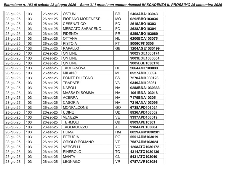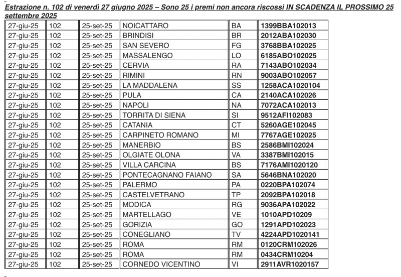 Si ricorda che i termini per la riscossione dei premi da 10mila euro ciascuno - 90 giorni dal giorno successivo alla pubblicazione del Bollettino Ufficiale – scadranno rispettivamente il 18, 19, 25 e 26 settembre 2025 a seconda della data del concorso giocato.
